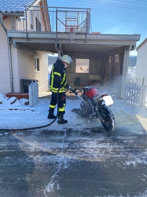 Die Hausbewohner meldeten über den Notruf 112 ein brennendes Leichtkraftrad in ihrem Carport.
